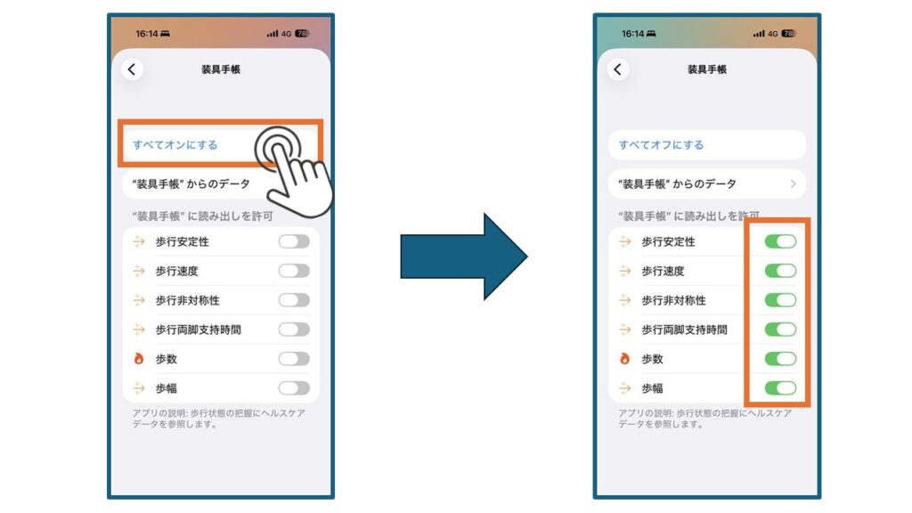 • 歩行安定性、歩行速度などの各項目が「オン(緑色)」になっているか確認